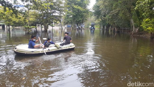 Pantauan detikJateng, di depan akses masuk Pantai Marina, Kamis (5/1/2023), terlihat banjir masih menggenangi hingga sebetis orang dewasa. Beberapa orang yang ingin masuk pun masih menggunakan perahu karet.