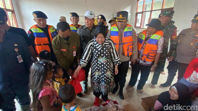 Rombongan Risma menumpang perahu untuk mencapai desa itu selama sekitar 30 menit. Jalan menuju desa itu terendam banjir hingga 1 meter.
