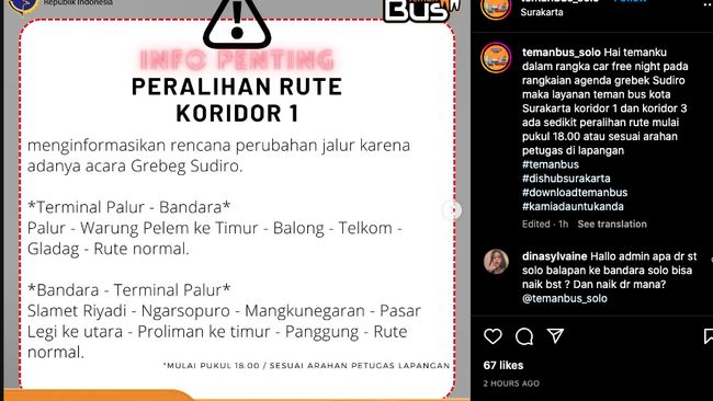 "Hai temanku dalam rangka car free night pada rangkaian agenda grebek Sudiro maka layanan teman bus kota Surakarta koridor 1 dan koridor 3 ada sedikit peralihan rute mulai pukul 18.00 atau sesuai arahan petugas di lapangan," tulis akun tersebutseperti dilihat detikJateng, Rabu (11/1/2023).