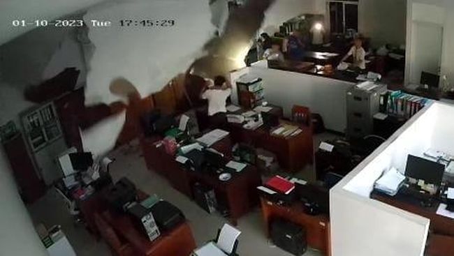Dalam video tampak petugas tengah melihat-lihat ruangan, tiba-tiba plafon ambrol hingga sejumlah karyawan yang berada di ruangan tersebut ketiban reruntuhan.