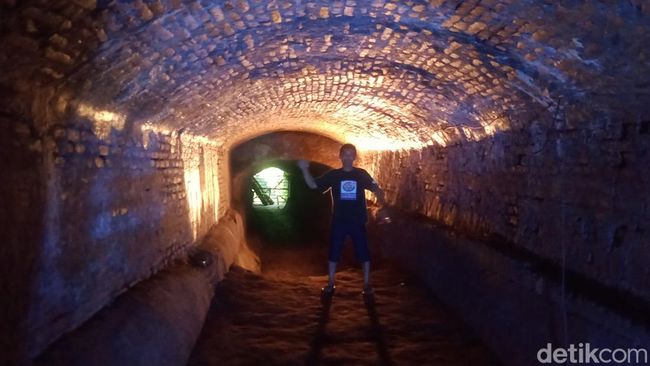 Di beberapa titik air rembes melalui dinding batu bata. Dua lampu yang dipasang untuk menerangi dua lorong tidak bisa menjangkau semua sudutnya.