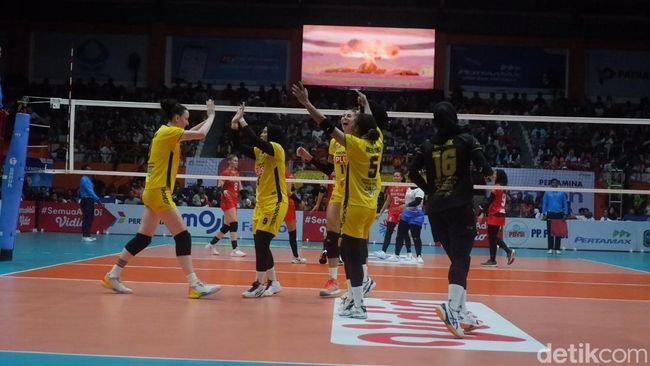 Di set pertama, tim asuhan Ayub Hidayat langsung unggul dengan skor 18-25 saat laga pamungkas seri kedua putaran pertama PLN Mobile Proliga 2023, di GOR Satria Purwokerto, Minggu (15/1/2023). Hasil positif juga didapat di set kedua dengan skor 17-25.
