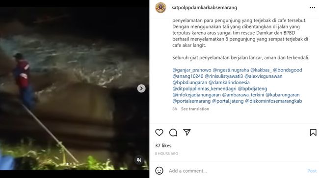 "Pemadam Kebakaran Kabupaten Semarang bekerjasama dengan BPBD Kabupaten Semarang @bpbd.ungaran melakukan evakuasi penyelamatan para pengunjung yang terjebak di cafe tersebut. Dengan menggunakan tali yang dibentangkan di jalan yang terputus karena arus sungai tim rescue Damkar dan BPBD berhasil menyelamatkan 8 pengunjung yang sempat terjebak di cafe akar langit," terangnya.