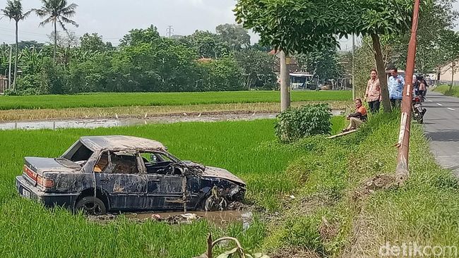 Sebuah mobil sedan terjun ke sawah di jalan Senden-Manjung, Klaten. Mobil berpelat AE tersebut ringsek dan berlumpur.