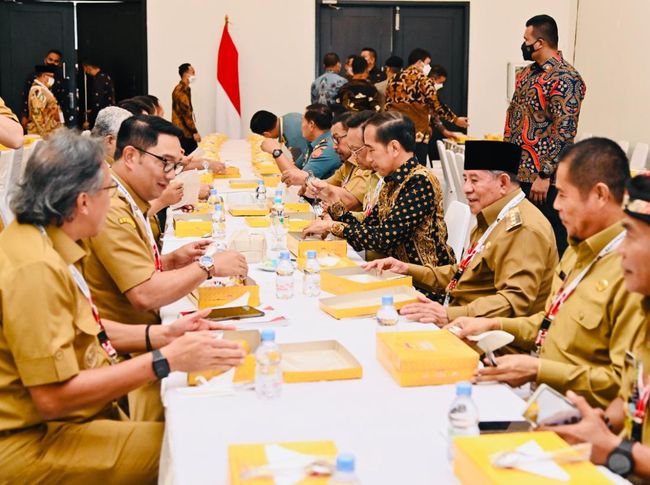 Selesai makan siang bersama para gubernur, Jokowi berjalan ke area Hall B yang menjadi tempat makan para bupati dan wali kota.