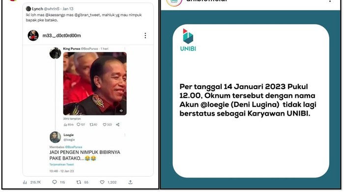 Baru-baru ini juga heboh unggahan seorang pegawai Universitas Informatika dan Bisnis Indonesia (UNIBI) Deni Lugina yang menghina Jokowi. Dalam tangkapan layar yang beredar, akun Twitter @Loegie pada 12 Januari kemarin membalas postingan akun @BosPurwa yang mengunggah video Jokowi saat menghadiri HUT ke-50 PDIP.