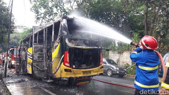 Bus itu memang terbakar habis. Bagian dalam dan luar bus habis. Hanya sebagian kecil saja cat bodi yang tidak ikut terbakar.