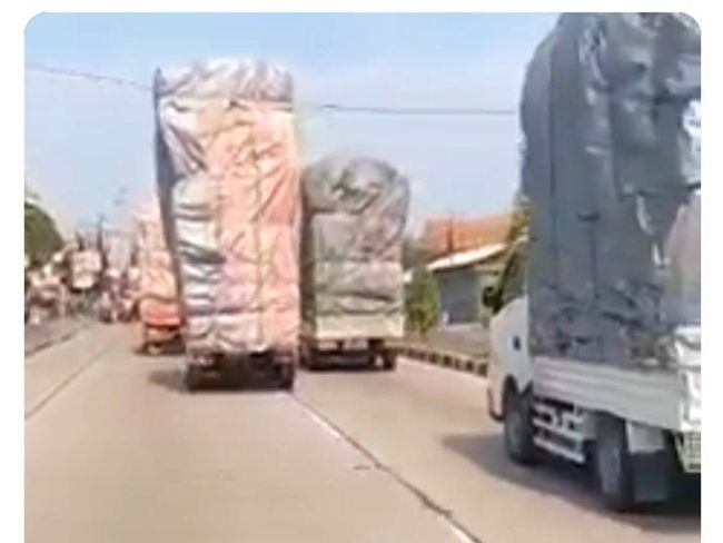Rombongan mobil pikap sarat muatan terekam kamera ponsel melaju di jalan Jogja-Solo, Terminal Penggung, Kecamatan Ceper, Klaten, Jawa Tengah. Mobil-mobil dengan muatan setinggi 4-5 meter itu viral saling kebut.