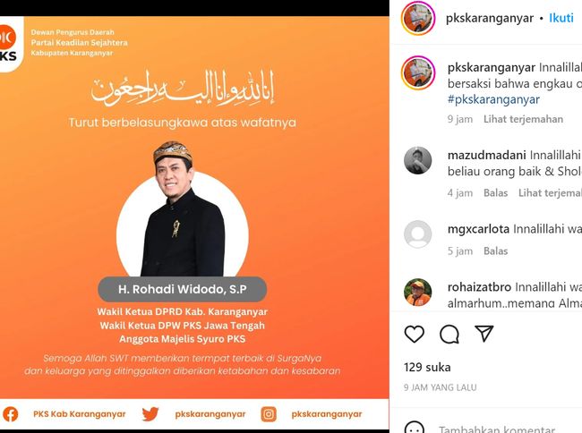 Hal senada juga disampaikan PKS Karanganyar. Lewat akun Instagramnya mereka juga menyampaikan duka cita atas berpulangnya Rohadi Widodo.