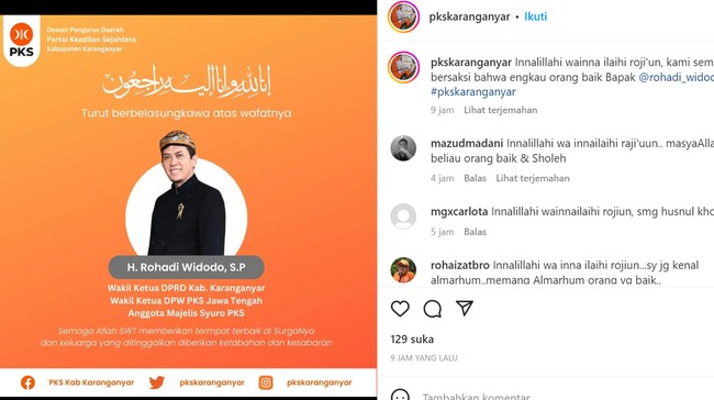 Diberitakan sebelumnya, mantan Wakil Bupati Karanganyar, Rohadi Widodo tutup usia pada Senin, 23 Januari malam. Saat ini, Rohadi menjabat sebagai Wakil Ketua DPRD Karanganyar dari Fraksi PKS.