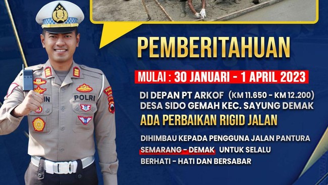 Jalan Pantura Demak Km 11.650-12.200 dalam proses perbaikan. Perbaikan pada lajur Semarang-Demak itu dijadwalkan mulai Senin (30/1) hari ini hingga 1 April 2023.