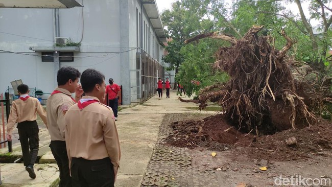 Namun, Jumat (3/2) pukul 07.15 WIB, pohon trembesi besar dekat gawang tumbang. Para siswa yang mendengar suara retakan langsung menyelamatkan diri sebelum pohon tumbang perlahan.