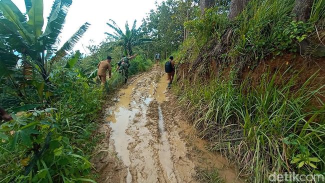 Ada beberapa titik jalan naik terjal. Jalan tersebut seperti jalan pertanian yang digunakan warga saat musim kemarau. Namun karena hujan, kondisi jalan berlumpur dan licin.
