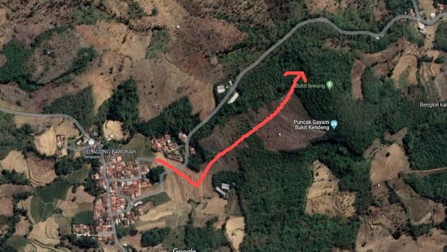 Dari depan Balai Desa menyusuri jalan aspal di permukiman warga. Sampai di pertigaan perbatasan jalan desa ada pertigaan jalan. Di lokasi jalan sudah tidak beraspal.