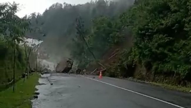 Dalam hitungan detik, material longsor pun turun menutup jalan. Sebongkah batu besar jatuh dan berhenti tepat di tengah jalan.