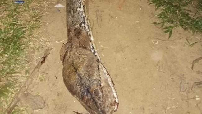 Ular piton berukuran sebatang batang kelapa dengan panjang delapan meter menggegerkan warga di Muna Barat, Sulawesi Tenggara (Sultra). Ular dengan berat 100 kilogram itu hampir saja memangsa babi hutan. Warga yang melihat, dengan berani langsung menebas lehernya hingga mati.