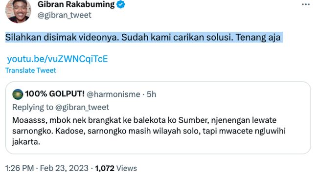 "Silahkan disimak videonya. Sudah kami carikan solusi. Tenang aja" tulis Gibran melalui akun pribadinya @gibran_tweet.