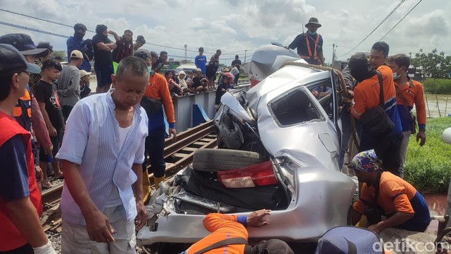 Kecelakaan tersebut terjadi perlintasan yang ada di Jalan Purwosari Raya, Kelurahan Tambakrejo, Kamis (23/2/2023) pada pukul 12.40 WIB. Pantauan detikJateng di lokasi sekitar pukul 14.00 WIB, terlihat mobil tersebut rusak berat di sisi kiri.