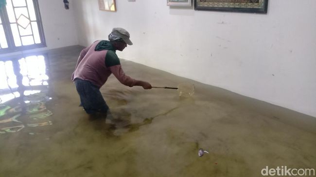 Lalu sebelum dijadikan lauk, ikan hasil tangkap tersebut ditaruh di ruang tamu yang tergenang banjir.
