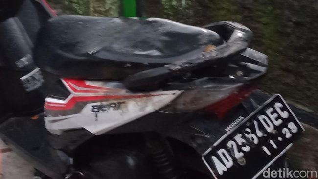 Pantauan detikJateng di lokasi, sepeda motor warna putih hitam itu tidak rusak berat. Hanya karet pada pelapis besi pegangan jok belakang meleleh seperti plastik terbakar.