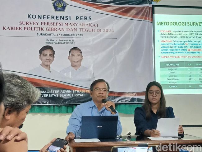 Ketua Prodi MAP Unisri, Suwardi mengatakan survei itu dilakukan pada 15-25 Februari 2023 dengan 560 koresponden. Survei dilakukan dengan instrumen data kuesioner tertutup dan wawancara langsung atau face to face di 56 titik lokasi.