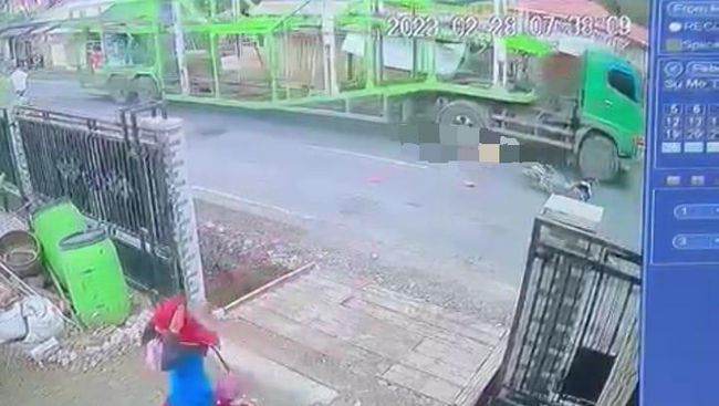 Dua pemotor tewas terlindas truk saat menerabas jalan rusak di Desa Kemurang Wetan, Tanjung, Kabupaten Brebes, Jawa Tengah. Kejadian mengerikan itu sempat terekam kamera CCTV.