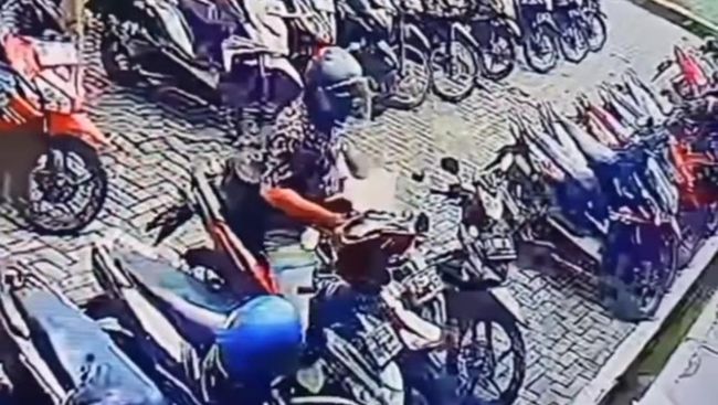 Dalam video memperlihatkan terduga pelaku pria datang naik sepeda motor. Dia memakai baju batik dan celana panjang serta sepatu, memasuki area parkiran dan memarkirkan sepeda motornya.