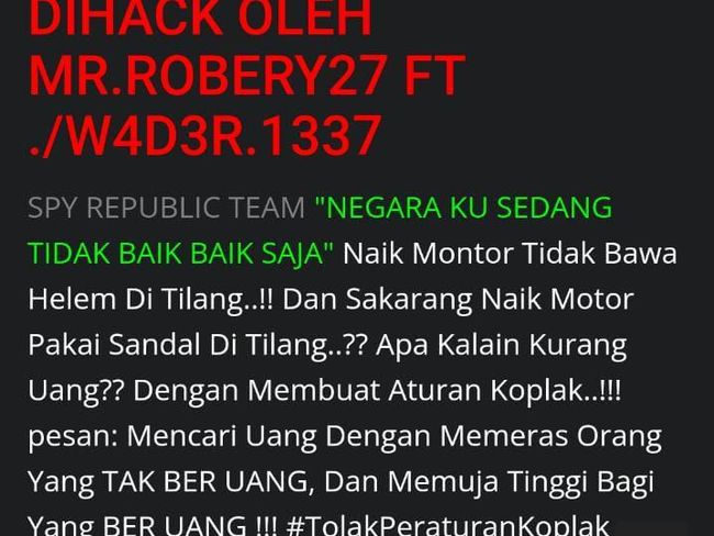 Peretas meninggalkan pesan identitas dan protes soal tilang yang dilakukan oleh polisi. Di antaranya soal naik motor tidak bawa helm ditilang, naik motor pakai sandal ditilang, dan pertanyaan apakah kurang uang.