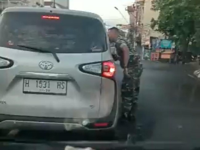 Dalam video tersebut terlihat seorang pria berseragam TNI tengah berdiri dan berkomunikasi dengan orang di dalam mobil berwarna silver berpelat H. Dia kemudian kembali ke mobilnya sambil menunjuk-nunjuk orang di dalam mobil tersebut.