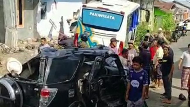 Selain korban luka, kecelakaan ini juga menyebabkan mobil rusak parah karena tertimpa bus.