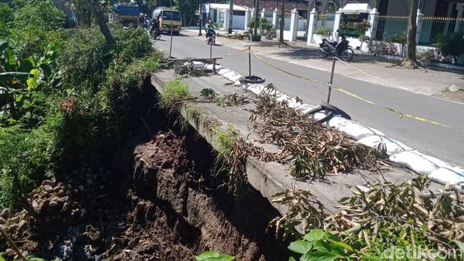 Jalan raya Tulung-Daleman di Dusun Ngaliyan, Desa Ngaliyan, Kecamatan Tulung, Klaten, ambrol. Bahu jalan longsor sedalam 5 meter dengan panjang sekitar 15 meter.