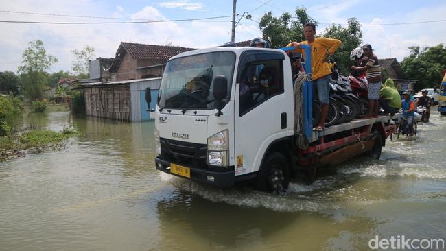 Jalan alternatif Pati-Rembang di Jakenan, Kabupaten Pati, masih kebanjiran. Alhasil jasa ojek truk pun laris manis disewa para pemotor.