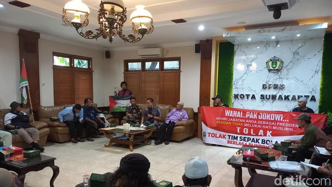 Warga yang mengatasnamakan dirinya Aliansi Solo Raya menggelar audiensi di DPRD Kota Solo. Mereka menolak timnas Israel bermain di Indonesia saat gelaran Piala Dunia U-20.