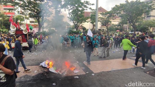 Sementara itu sejak pukul 17.00 WIB, berangsur-angsur massa aksi membubarkan diri. Spanduk tuntutan juga terlihat ikut dibakar di lokasi.