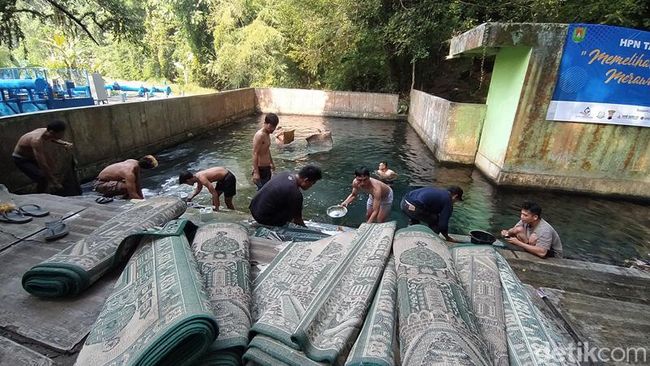 Pantauan detikJateng, Senin (20/3/2023), pencucian karpet Musala Anasir ini dilakukan di kompleks mata air Ndas Gending, Desa Sukorejo, Kecamatan Mertoyudan. Pencucian karpet melibatkan belasan orang.