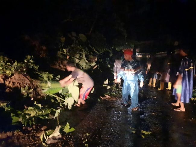 Hingga malam ini, sejumlah petugas menyingkirkan batang pohon yang melintang di jalan agar kendaraan bisa lewat.