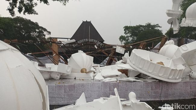 Dari pantauan detikJateng, ornamen berbentuk masjid berwarna putih itu ambruk tak beraturan di halaman Balai Kota Solo. Ornamen itu terbuat dari bahan styrofoam.