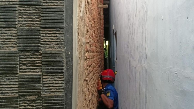 Akhirnya, petugas meminta izin pemilik rumah untuk membobol tembok agar korban bisa diselamatkan. Saat itu korban sudah terlihat lemas.