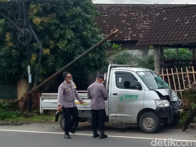 Sebuah mobil pikap berpelat nomor AA 8203 CJ menabrak tiga tiang telepon di jalan Jogja-Solo wilayah Desa Klepu, Kecamatan Ceper, Klaten, Jawa Tengah. Mobil bertulisan SMK Ma'arif 6 Ayah itu ringsek bagian depannya.