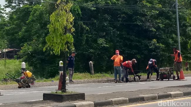 Ruas Jalan Jogja-Solo di Desa Jambu Kulon, Kecamatan Ceper, Klaten, langsung diperbaiki usai seorang pemotor tewas terlindas truk. Perbaikan jalan dilakukan dengan penambalan.