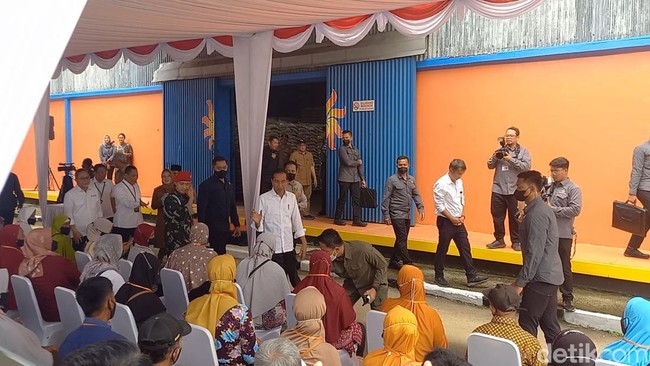 Presiden dan rombongan tiba di lokasi pukul 10.45 WIB. Jokowi langsung memberikan bantuan beras seberat 10 kilogram kepada warga yang menunggu di gudang Bulog.
