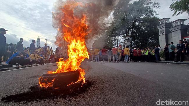 Tak hanya itu, mahasiswa membakar ban agar permintaannya dipenuhi. Mereka menuntut agar Bupati maupun Ketua DPRD atau yang mewakili bisa menemui massa dan menandatangani pernyataan sikap menolak pengesahan UU Ciptaker.