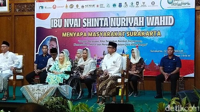 Istri Presiden RI ke-4, Shinta Nuriyah Wahid menghadiri acara Safari Kebangasaan di Balai Kota Solo, Rabu (12/4/2023). Kehadiran Shinta Wahid disambut oleh Wakil Wali Kota Solo Teguh Prakosa.