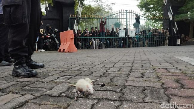 Demo dilanjutkan dengan aksi melempar tikus hidup. Mahasiswa melempar dua ekor tikus ke arah gedung DPRD Jateng.