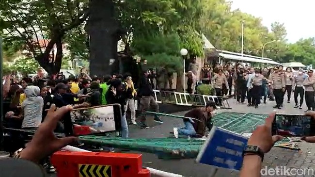 Massa berpindah ke gerbang belakang kompleks perkantoran tersebut. Polisi yang berada di lokasi sempat mengejar massa usai gerbang dijebol.