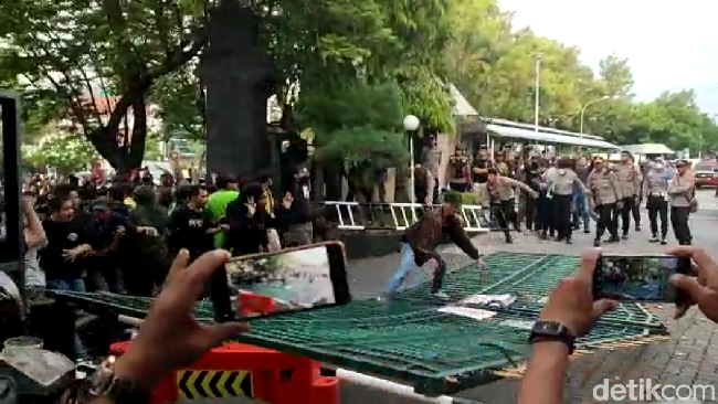 Kericuhan berawal saat massa menginjak kawat berduri yang disiapkan polisi. Polisi kemudian membuat barikade berhadapan dengan mahasiswa.