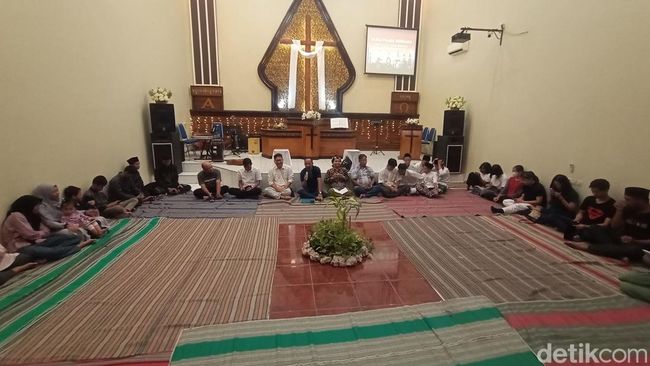Pantauan detikJateng, Rabu (19/4/2023) sore, puluhan santri dan pemuda gereja berkumpul jadi satu di GKMI Winong. Mereka terdiri dari santri Ponpes Singo Gendeng, santri Masjid Al-Muqorrobin, dan pemuda gereja.