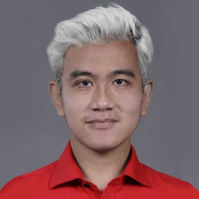 Foto tersebut adalah foto dirinya yang mengenakan baju merah. Menariknya, rambut Gibran diedit menjadi serba putih.