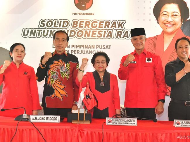 Megawati didampingi oleh Presiden Jokowi saat itu. Ada juga Ketua DPP PDIP Prananda Prabowo dan Ketua DPP PDIP Puan Maharani.