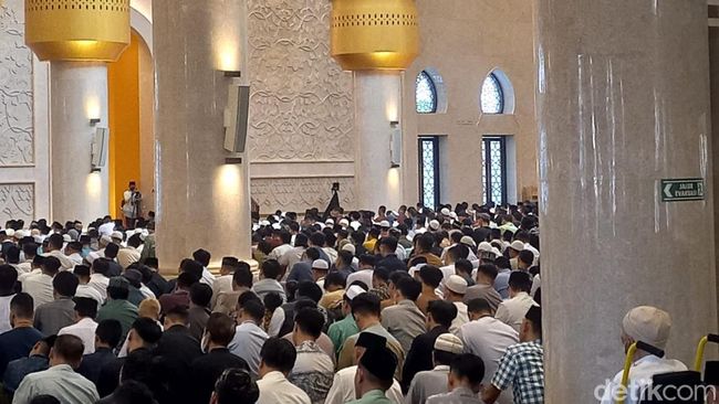 Jemaah yang mengikuti salat Id ini hingga selasar masjid. Masjid Sheikh Zayed memiliki kapasitas sekira 10 ribu jemaah.